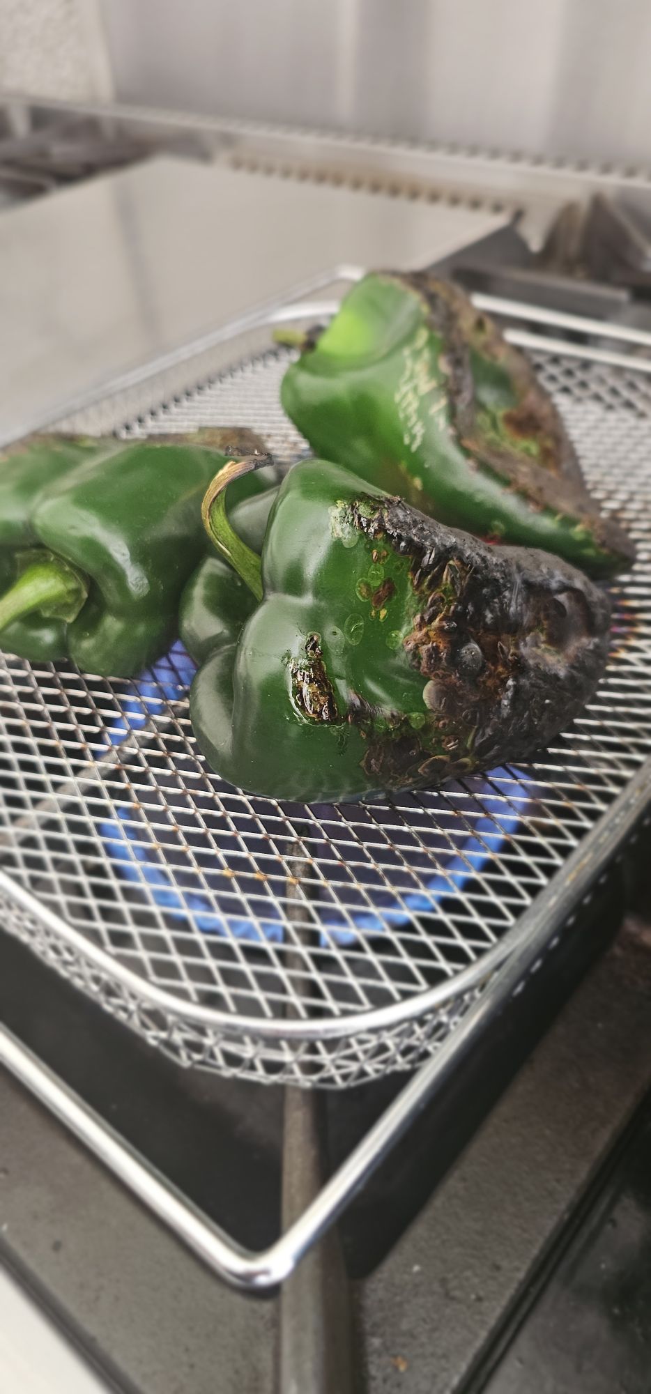 - Char the skins: Using tongs, place poblanos on the rack directly above the flame. Let one side blister and blacken (about 1–2 minutes), then rotate with tongs to char the other sides evenly. Continue until the peppers are blackened all over — the flesh underneath will remain intact.