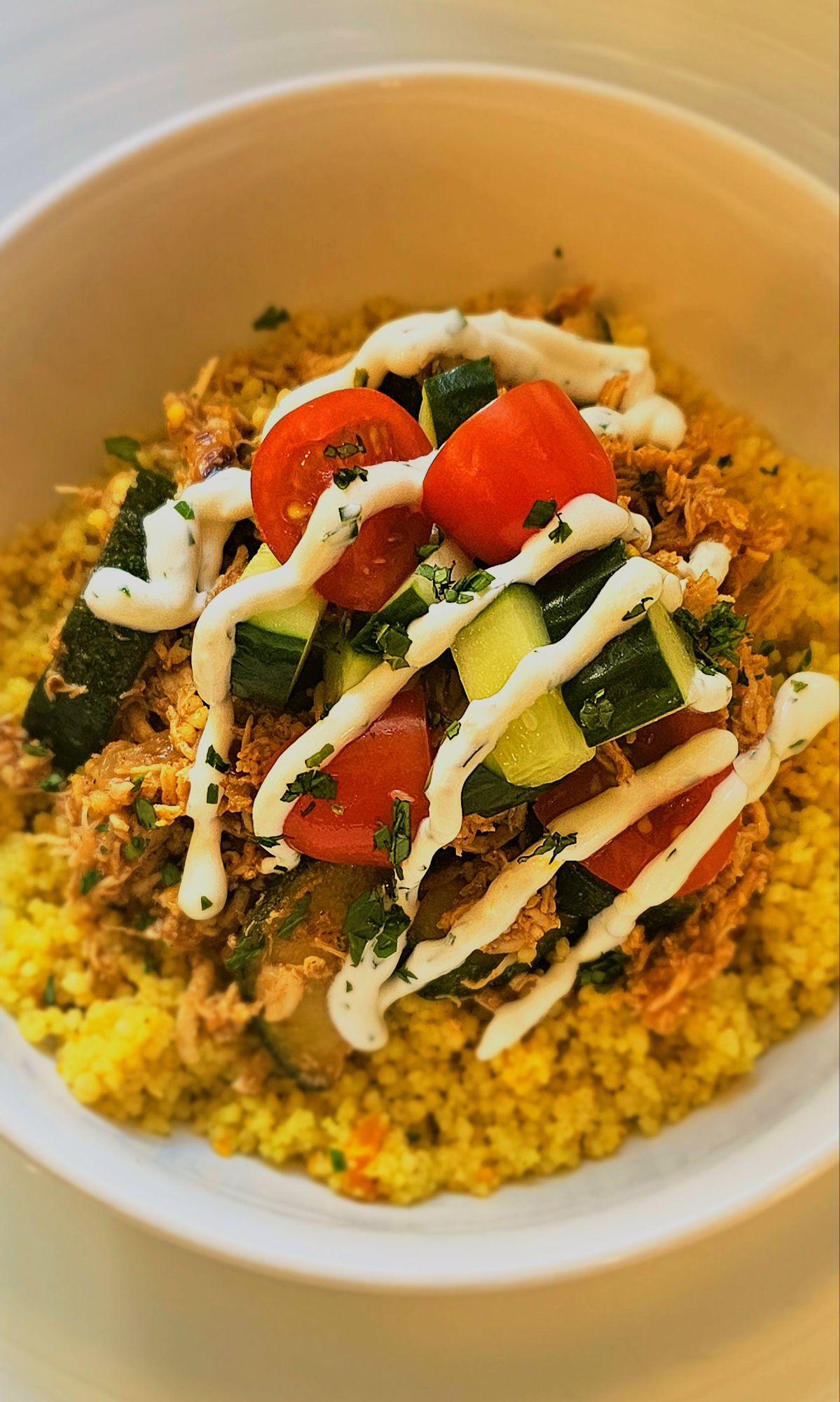 Spoon couscous into bowls. Top with spiced chicken and zucchini. Drizzle generously with the lemon-herb yogurt sauce. Finish with nuts, pomegranate, or chopped veggies for color and crunch.