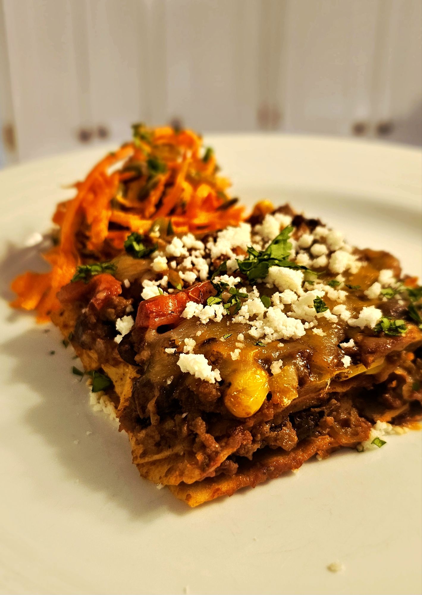 This baked beef gratin blends a classic enchilada profile with subtle molé inspiration — a hint of cocoa, warm cinnamon, and smoky chili that deepen the sauce without overpowering it. The result is familiar comfort layered with a rich, restaurant-worthy edge that turns an easy weeknight meal into something special.