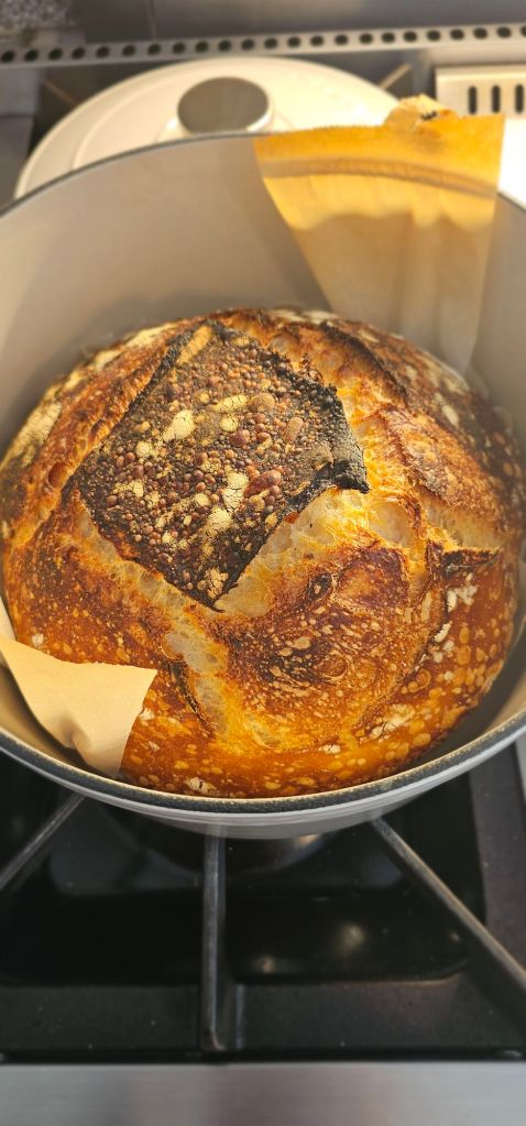 The Lodge 5.5 qt Dutch oven gives plenty of headroom for oven spring; use parchment for an easy transfer.