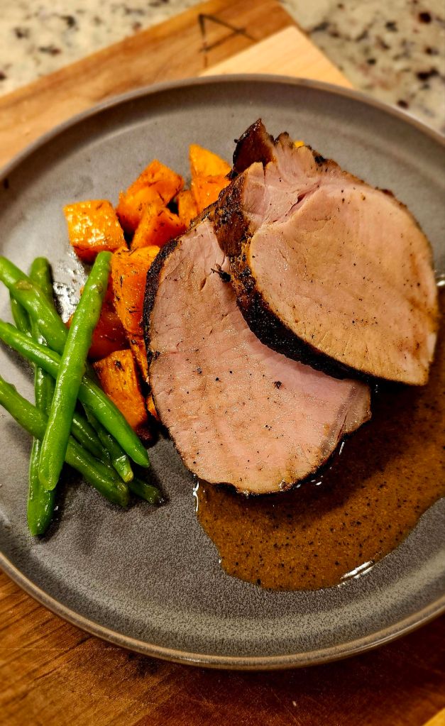 A cozy, fall-inspired dinner — tender sous vide pork infused with garlic and herbs, finished with a golden sear and served alongside caramelized roasted sweet potatoes.