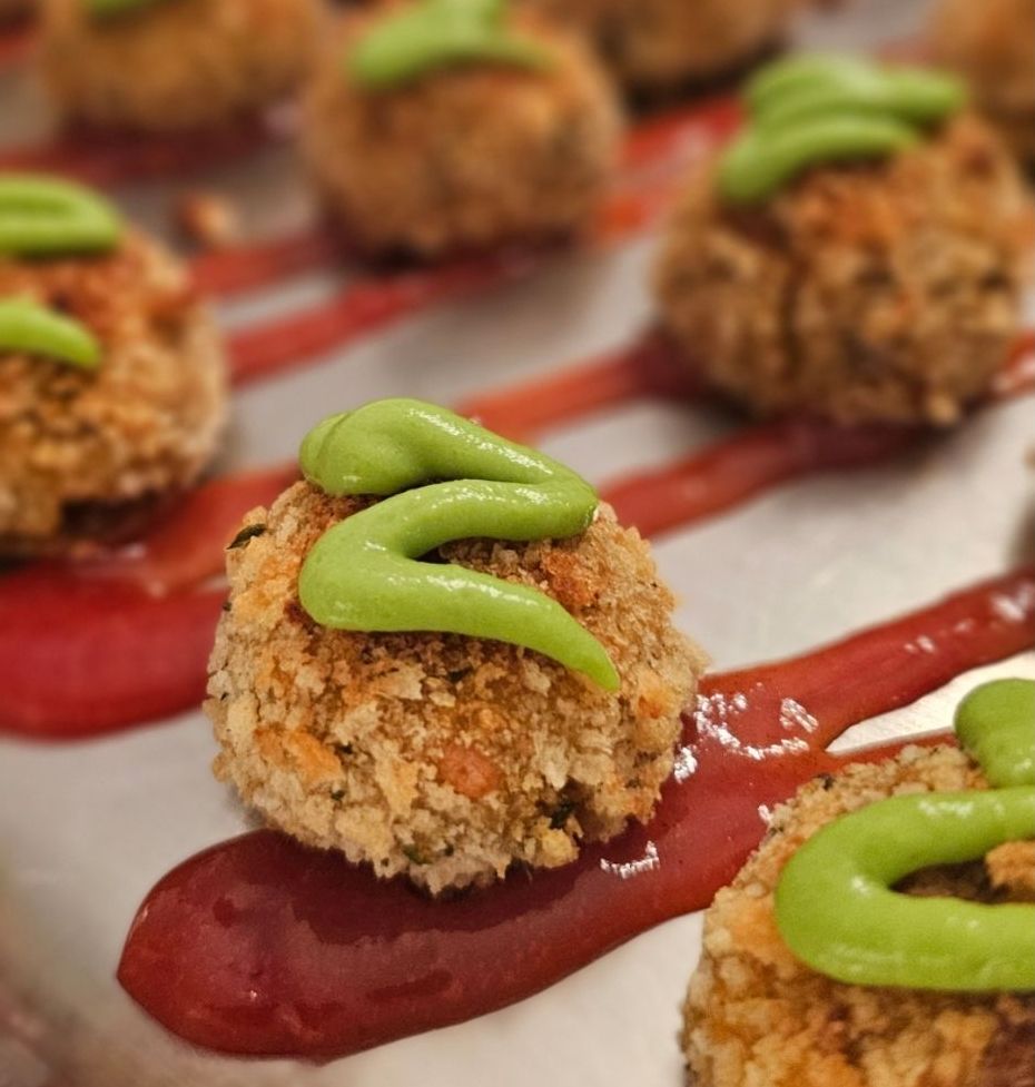 - Top with 1–2 croquettes and garnish with microgreens or fried shallots.