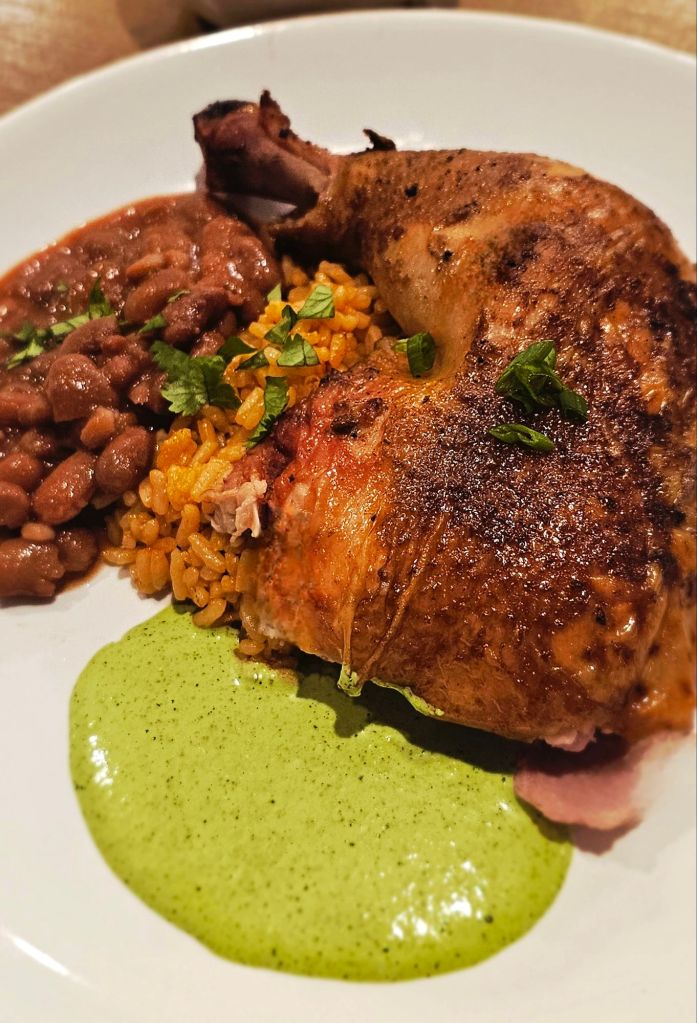 Plate a generous scoop of rice, ladle the stewed beans alongside or on top, and carve the chicken into pieces. Drizzle or serve a spoonful of aji verde alongside for bright, herbal heat. Fried potatoes or a simple green salad are excellent additions.